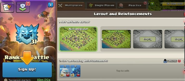 از زمانی که به تاون 7 میرسید، نبرد رتبه بندی شده یا همون Ranked Battle کلش اف کلنز برای شما باز خواهد شد! این بخش درواقع یک تورنومنت هفتگی است که شما موظف هستید برای شرکت در اون، روز دوشنبه هر هفته با کلیک روی دکمه Sign Up ثبت نام انجام بدید. (قابلیت ثبت نام خودکار هم وجود داره تا نیاز نباشه هر دوشنبه بصورت دستی اینکارو بکنید)