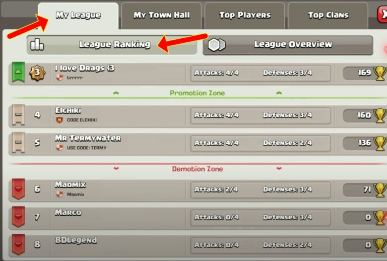 به یاد داشته باشید که در شروع هفته زمانی که تورنومنت شروع میشود، تمامی بازیکنان لیگ دارای 0 تروفی هستند تا به مرور با شروع اتک و دفاع، جایگاه آنها مشخص شود. نحوه تعیین جایگاه افراد در هر تورنومنت بر اساس میانگین تعداد ستاره های کسب شده در هر اتک خواهد بود.
